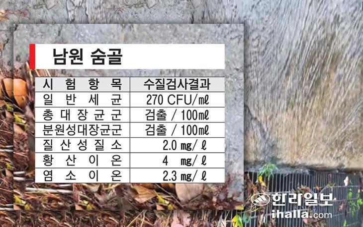 이와 관련, 도내 지하수 전문가는 "남원 숨골의 경우 질산성 질소가 먹는 물 기준치 보다 상당히 낮아 비교적 주변 지역 오염원은 크지 않다고 판단되나, 주변 과수원에 시비하는 퇴비 또는 화학비료 등으로부터 질산성질소는 소량 생성되는 것으로 보인다"면서 "다만, 정수장이 아닌 지표에 노출된 지표수로는 비교적 깨끗한 것으로 보인다"고 말했다.