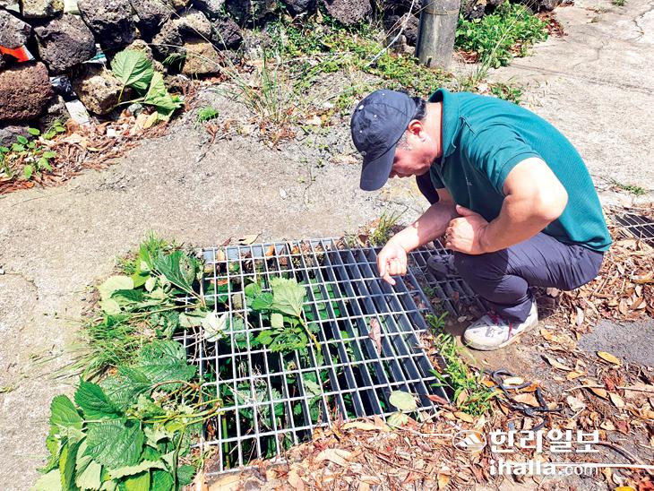 도로밑에 있는 숨골을 강순석 제주지질연구소장이 조사하고 있다.