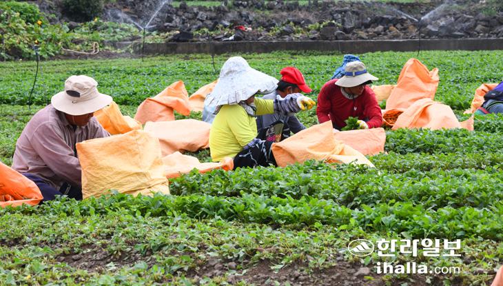26일 제주시 애월읍 한 밭에서 농민들이 취나물 수확 작업으로 분주한 시간을 보내고 있다. 이상국기자