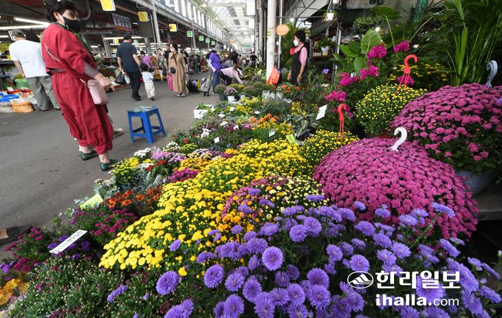 27일 장이 열린 제주시민속오일시장에 활짝 핀 국화꽃이 익어가는 가을 향기를 전해주고 있다. 강희만기자