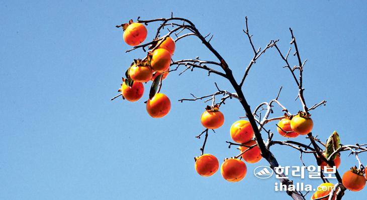 파란 하늘이 드러난 27일 제주시 오라동 한 가정집 정원에 감이 노랗게 익어가고 있다. 강희만기자