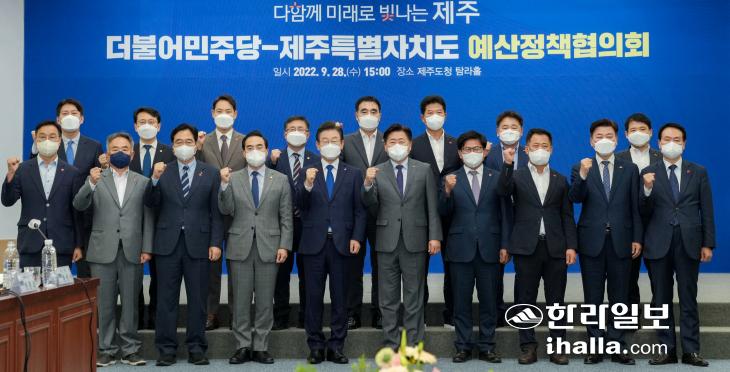 28일 제주도청 탐라홀에서 열린 제주특별자치도와 더불어민주당의 예산정책협의회에서 이재명 당 대표와 오영훈 제주도지사를 비롯한 참석자들이 기념사진을 찍고 있다. 이상국기자