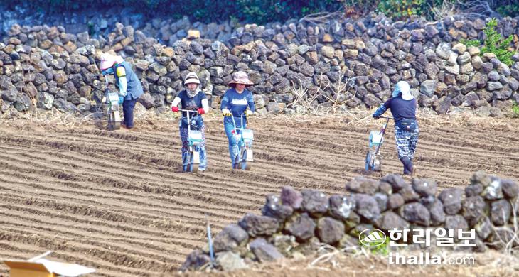 28일 제주시 구좌읍 한 밭에서 농민들이 무 파종작업으로 분주한 시간을 보내고있다. 이상국기자