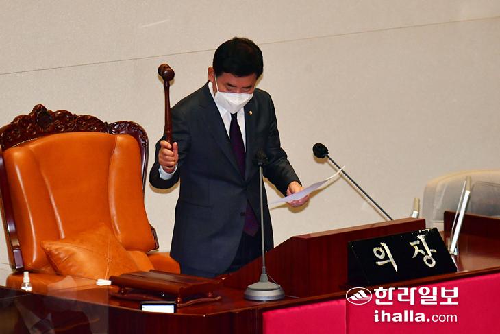 김진표 국회의장이 29일 국회에서 열린 본회의에서 박진 외교부 장관에 대한 해임건의안이 가결됐음을 선포하고 있다. 연합뉴스