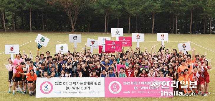지난 2일 천안 재능교육연수원에서 2022 K리그 여자풋살대회 퀸컵(K-WIN CUP)에 참가한 선수들이 단체 기념촬영을 하고 있다. 한국프로축구연맹 제공