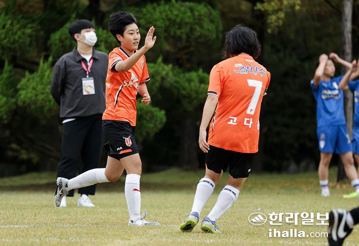 2일 천안재능교육연수원에서 열린 2022 K리그 여자풋살대회 퀸컵에서 제주와 경남의 경기에서 제주 선수가 골을 넣고 동료와 기쁨을 나누고 있다. 한국프로축구연맹 제공