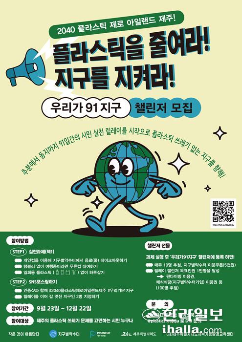 [한라일보] "플라스틱 없이 하루를 살아보면 어떨까." 기후위기에 대응해 거창한 구호보다는 실생활에서 실천 가능한 프로그램을 이어오고 있는 제주 환경단체 '작은 것이 아름답다'(대표 이경아)가 일회용품 없이 하루를 살아보자는 제안을 하며 릴레이 챌린지를 운영하고 있다. 9월 23일부터 12월 22일까지 91일 동안 진행되는 '우리가 91 지구'다.