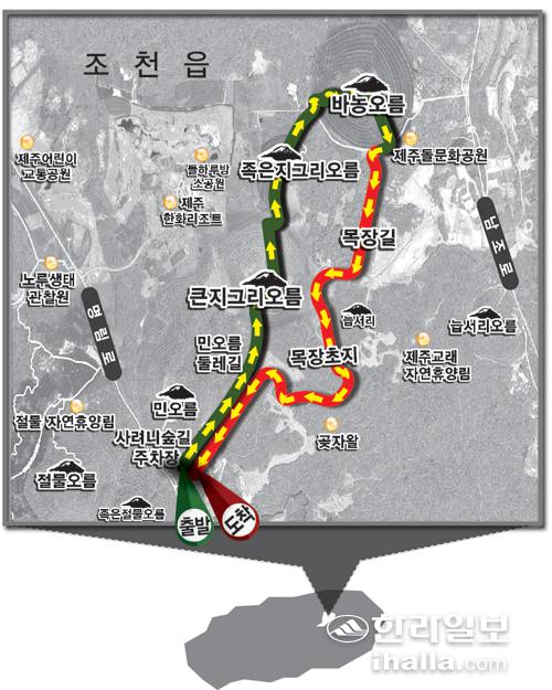 '[한라일보] 가을이 왔네요!'라고 말하면 사람들은 하늘을 본다. 하늘은 높고 말이 살찌는 계절이 가을이라는 무의식이 작동하는 것이다. 시야가 트인 오름 정상에서 구름이 그려진 높은 하늘을 보면 그 말은 사실로 다가온다. 물감 가득 적신 거친 붓으로 쓱 그린 듯한 하얀 구름은 자유롭다. 길을 걷는 내내 귓불을 스치는 아삭한 바람은 땀이 날 여유를 주지 않는다. 청띠제비나비 두 마리가 하늘을 날아오르며 서로 희롱하는 초원을 가로지르며 걷는 즐거움도 빼놓을 수 없다. 목장길 주변 억새 무리는 꽃을 달고 적당한 때를 기다리고 있다. 가을이 전성기에 접어들면 빛을 받아 찬란하게 피어나리라.