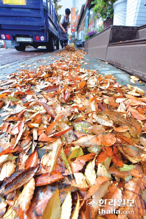 가을비가 흩뿌린 4일 제주시 오라1동 서사로에서 한 주민이 인도에 쌓인 낙엽을 쓸고 있다. 이상국기자