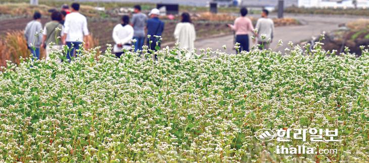 4일 서귀포시 대정읍 하모리 농경지에 활짝 핀 메밀꽃이 제주의 가을 정취를 한껏 느끼게 하고 있다. 강희만기자