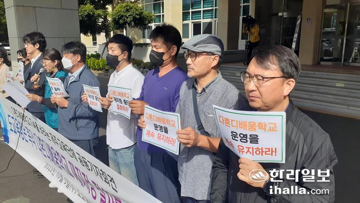 5일 전교조제주지부 등이 제주도교육청 앞에서 기자회견을 열고 제주형 자율학교인 '다혼디배움학교' 재지정 절차의 조속 이행을 촉구하고 있다. 강희만기자