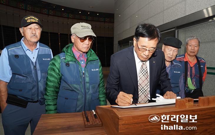 정기영 미주총연회 회장이 위패봉안실에 마련된 방명록에 추모의 글을 쓰고 있다. 송은범기자