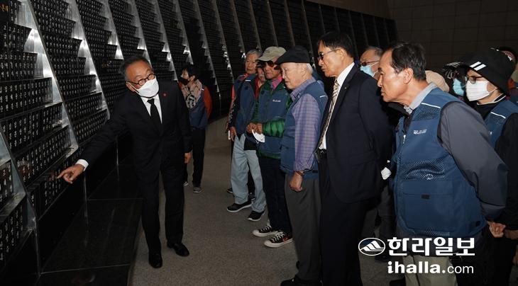 고희범 4·3평화재단 이사장이 (사)대한노인회 미주총연합회 회원들을 대상으로 북촌리 사건에 대해 설명하고 있다. 송은범기자