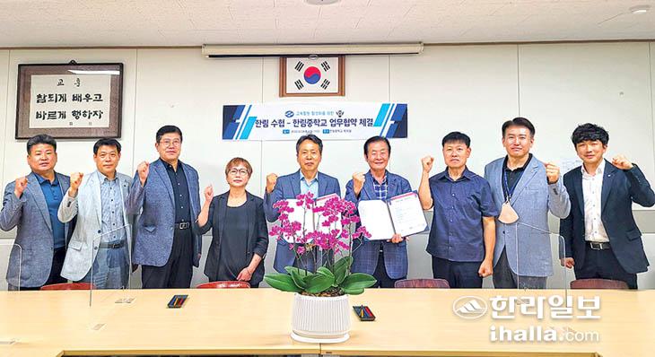 한림중학교(교장 김형희)는 지난 4일 한림 수산업협동조합과 학교 교육 활동 활성화, 학교 운동부 지원을 통한 지역사회와의 네트워크 형성을 취지로 업무협약을 체결했다. 수협에서는 "학생들의 교육활동 활성화와 꿈을 키우는 데 보탬이 될 수 있어서 기쁘다"며 "앞으로도 지역사회의 기관으로서 책임을 다해 더 좋은 교육 활동이 될 수 있도록 적극적으로 협력하고 도울 것"이라고 약속했다.
