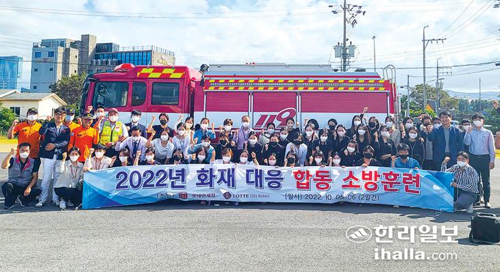 롯데면세점 제주(주)(점장 이종민)와 연동119센터(센터장 강성철)는 지난 5~6일 제주시 도두동 소재 롯데면세점 야외 주차장에서 롯데면세점 사내 자위소방대 120여명이 참가한 가운데 화재 진압 훈련을 실시했다.