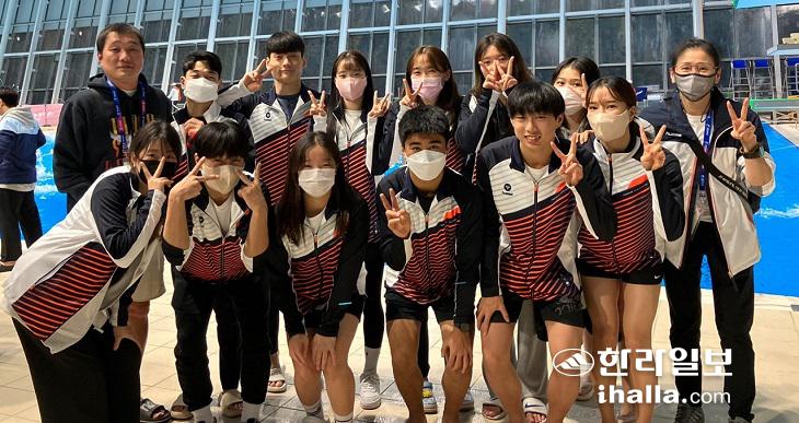 제103회 전국체육대회에서 최다 메달을 획득한 제주특별자치도 다이빙선수단이 11일 대회 시상식이 끝난 뒤 기념촬영을 하고 있다.