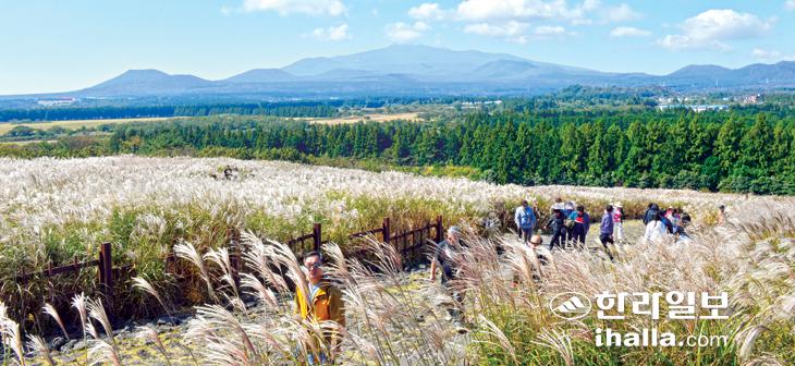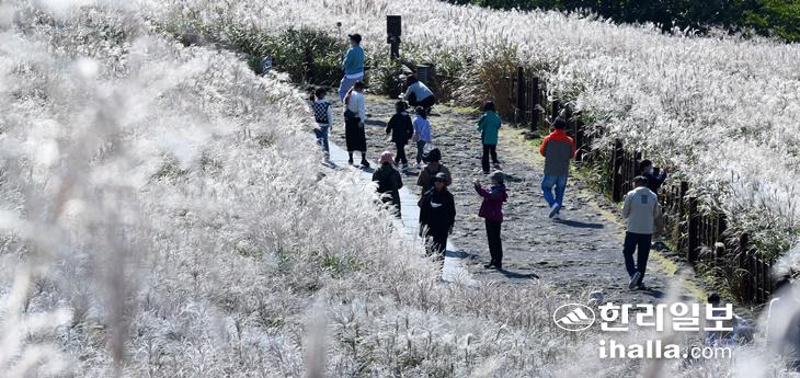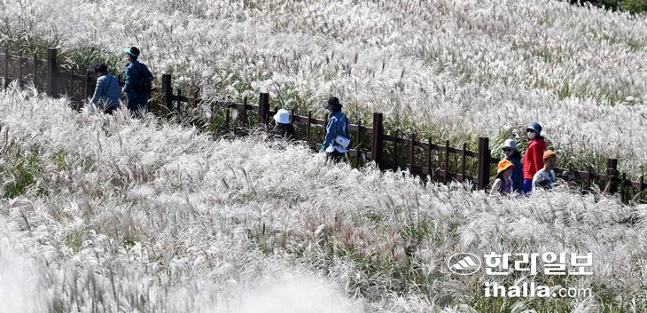 시나브로 가을이 깊어간다. 산야는 붉은 빛으로 농익어 가고, 억새들의 은빛은 하루가 다르게 선명해진다. 12일 제주시 조천읍 산굼부리를 찾은 도민과 관광객들이 은빛 물결 넘실대는 억새밭을 배경으로 기념사진을 촬영하고 있다. 이상국기자