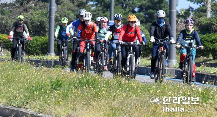13일 제주시 한경면 용수리 일주도로에서 라이더들이 제주가을을 만끽하며 달리고 있다. 강희만기자