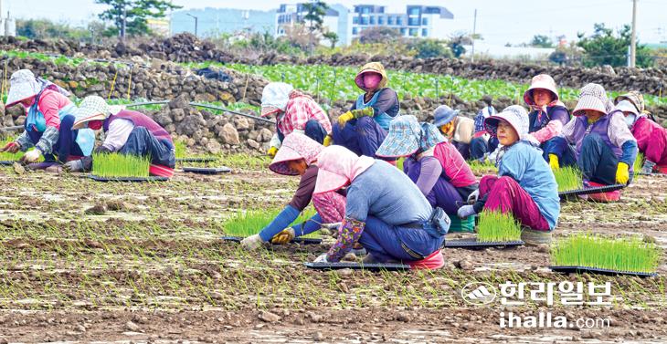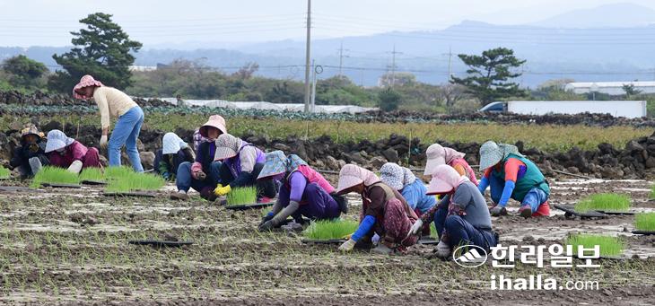 13일 제주시 한림읍 수원리 한 농경지에서 어르신들이 양파모종 파종작업을 하고 있다. 강희만기자