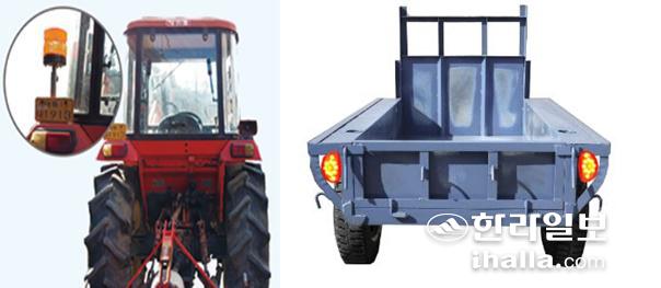 트랙터에 부착된 저속차량 표시등(왼쪽)과 경운기 방향지시등. 사진=제주시