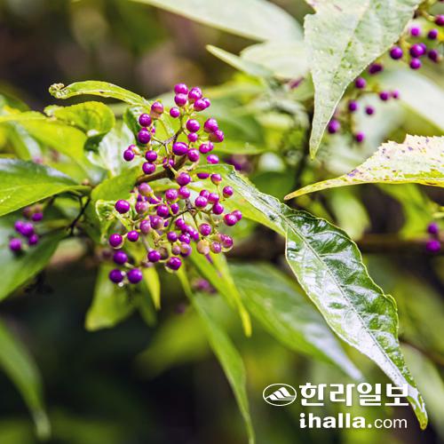 숲길 언저리에는 한라돌쩌귀가 보라색 꽃을 가득 달고 인사를 한다. 가을 산에 오르면 유독 보라색 꽃들이 많다. 가을 야생화는 곤충, 특히 벌의 눈에 잘 띄는 보라색 계통의 꽃을 피운다. 가을에는 나비보다 벌이 주요 꽃가루받이 매개자인데, 노랗거나 빨갛게 물드는 단풍 사이에서 벌의 눈에 쉽게 띄기 위해 대비되는 색인 보라색을 택했을 것이다. 빨간 열매를 매단 나무와 노란 단풍을 달고 있는 나무들이 한데 어울려 있는 숲길은 한 해를 마무리하려 한다.