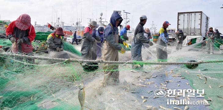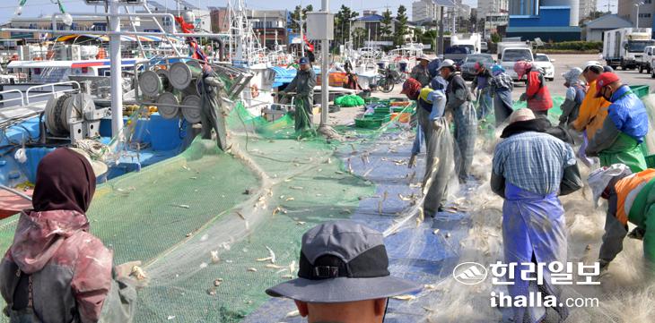 17일 제주시 한림항에서 어민들이 참조기를 그물에서 분리하는 작업을 하고 있다. 이상국기자