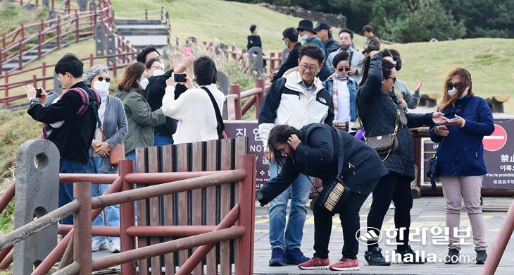 기온이 뚝 떨어지며 쌀쌀한 날씨를 보인 17일 서귀포시 성산읍 성산일출봉을 찾은 관광객들이 두꺼운 외투를 입고 탐방에 나서고 있다. 강희만기자