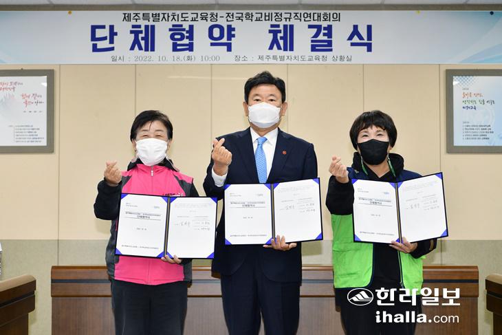 제주도교육청과 전국학교비정규직연대회의 전국공공운수노동조합, 전국학교비정규직노동조합이 18일 도교육청 상황실에서 단체협약 체결 후 기념촬영을 하고 있다. 사진=제주도교육청