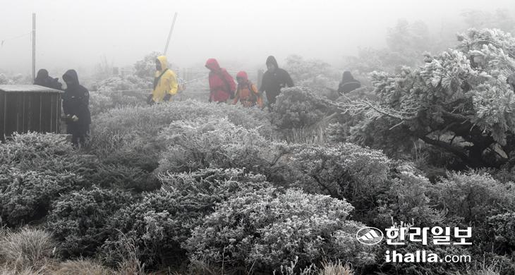 18일 한라산의 기온이 영하로 떨어지면서 영실 등반로 선작지왓 주변 나무에 상고대가 하얗게 내려 앉았다. 강희만기자