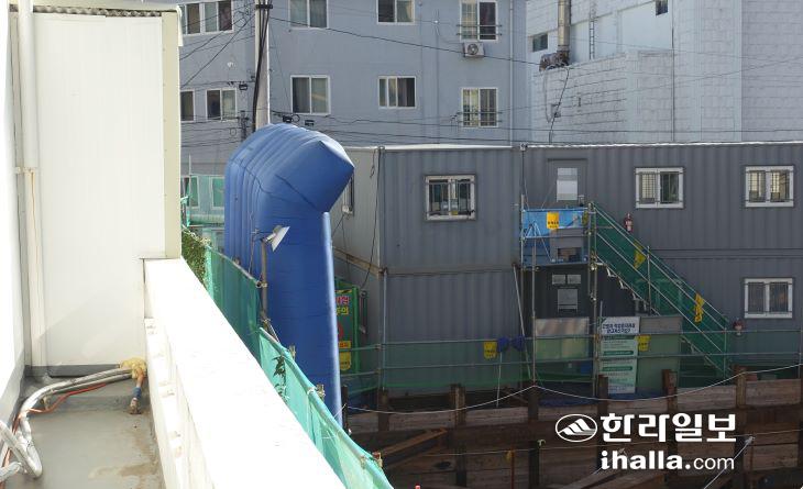 A 씨의 집(왼쪽 흰색 건물)과 바로 맞닿아 있는 재건축 공사 현장. 김도영기자