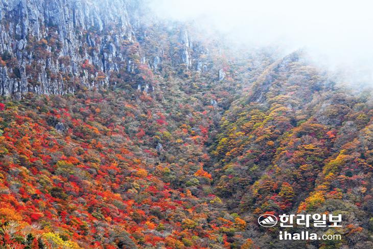 19일 한라산 영실등반로에 울긋불긋한 단풍이 절정을 이뤄 장관을 연출하고 있다. 강희만기자
