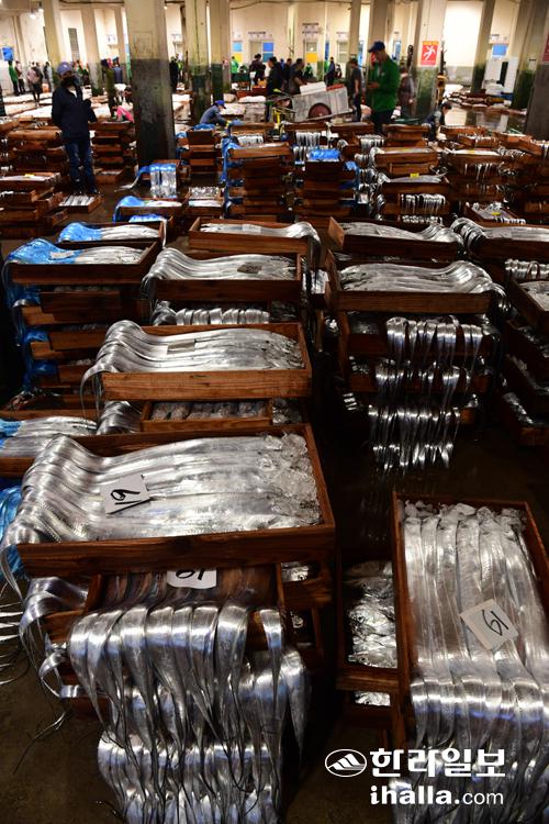 21일 제주시 한림읍 한림수협 위판장에서 어민들이 잡아온 갈치를 경매사와 중개인들이 경매를 하고 있다. 강희만기자