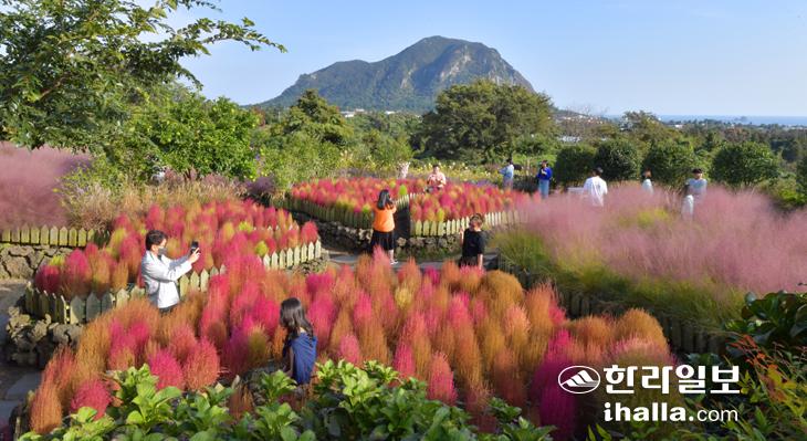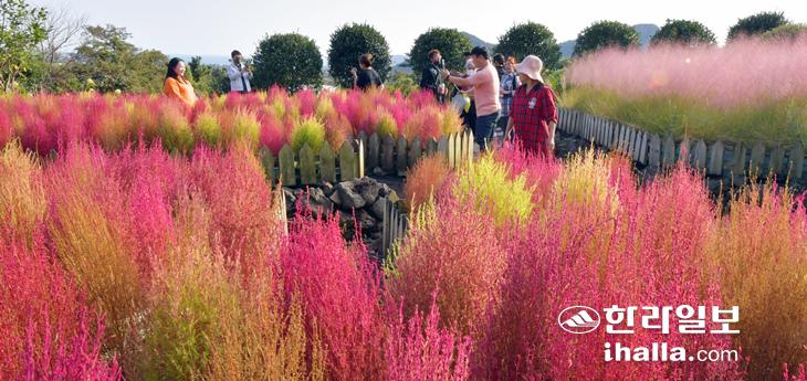 21일 서귀포시 안덕면 마노르블랑을 찾은 관광객들이 알록달록 색깔을 뽐내는 댑싸리를 배경으로 기념사진을 찍고 있다. 이상국기자