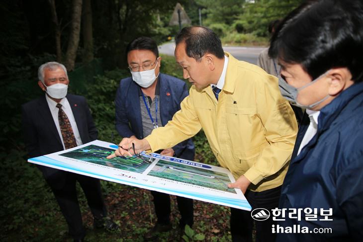 강병삼 제주시장이 지난 6일 아라동 파크골프장 조성 부지를 방문해 현장을 보고 있다. 제주시 제공