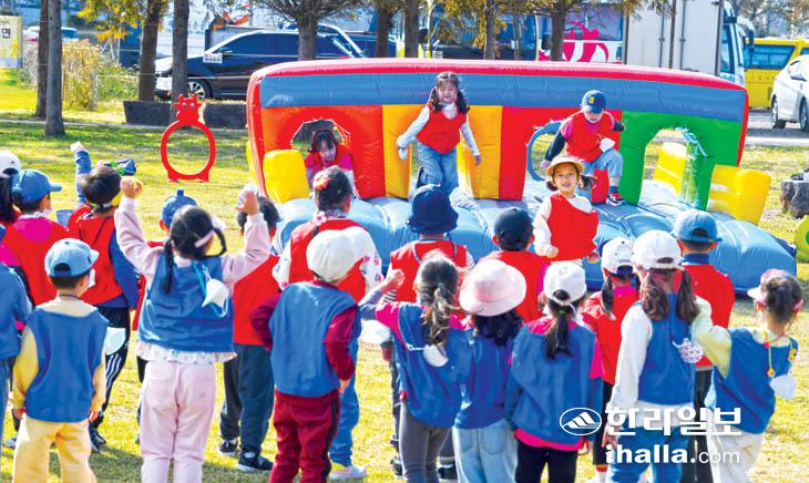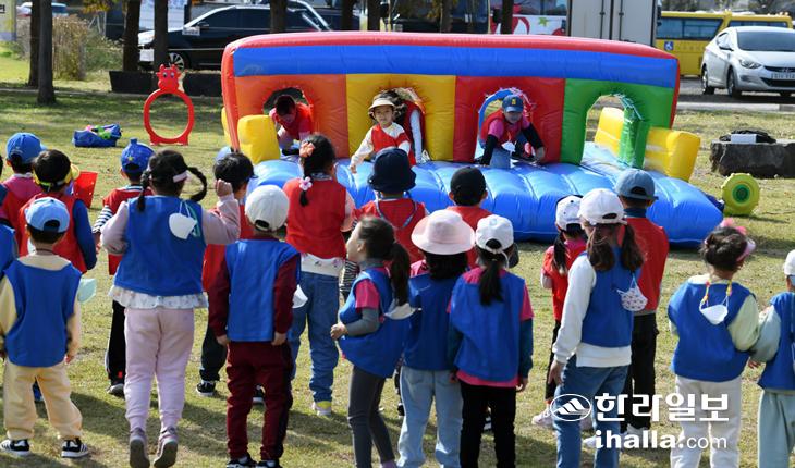 26일 제주시 시민복지타운에 한 어린이집 원아들이 가을소풍을 나와 게임을 하며 즐거운 시간을 보내고 있다. 강희만기자