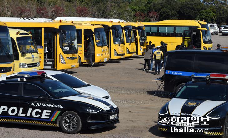 26일 제주시 시민복지타운 주차장에서 제주도교육청과 도로교통안전공단, 제주자치경찰 합동으로 어린이통학버스 정기 합동점검이 실시되고 있다. 강희만기자