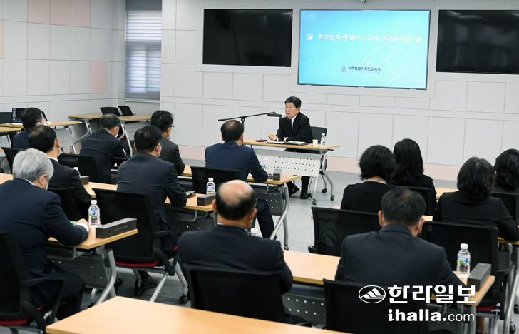 김광수 교육감이 지난 25일 제주시 중학교 교장들과 대화의 시간을 갖고 있다. 제주도교육청