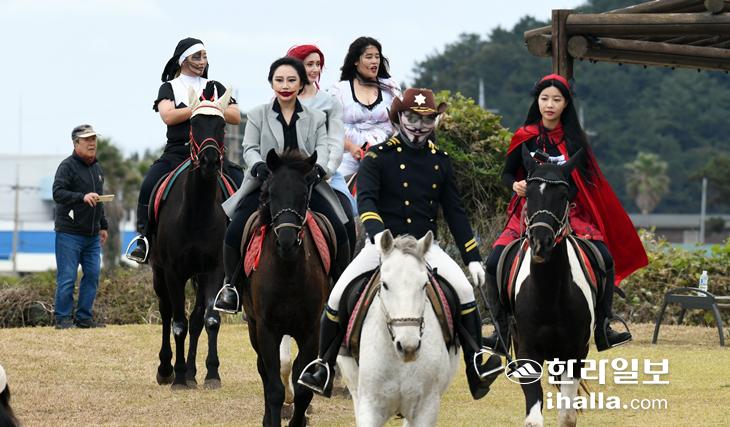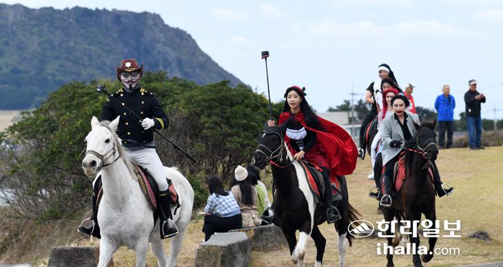 27일 제주시 구좌읍 해안도로에 만화 캐릭터로 분장한 한무리의 사람들이 승마로 즐거운 제주관광을 하고 있다. 강희만기자