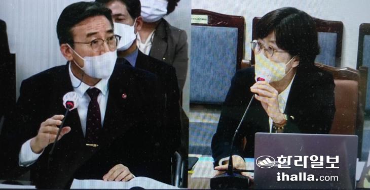 서귀포시 도시우회도로 개설에 따른 서귀포학생문화원 등 4개 교육기관 이설과 관련한 제주도와 제주도교육청의 대체 부지 협상 과정을 놓고 28일 행정사무감사에서 공방을 벌이고 있는 고의숙 교육의원(오른쪽)과 오순문 부교육감(왼쪽). 인터넷방송 화면.