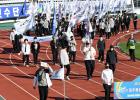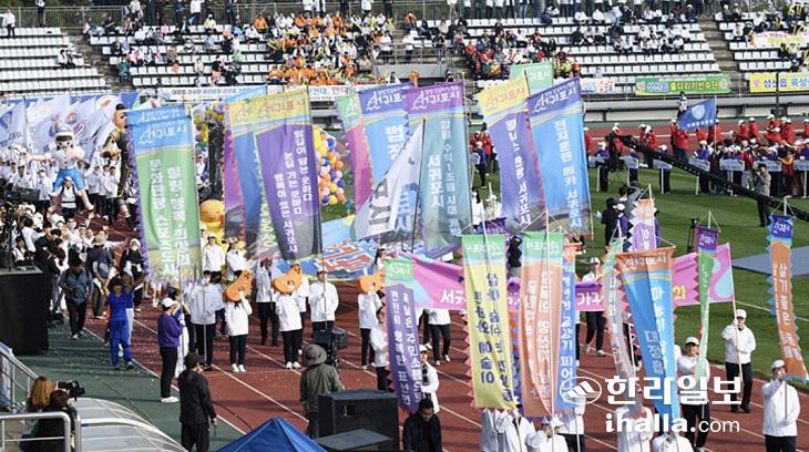 28일 오후 서귀포시 강창학경기장에서 열린 제56회 제주특별자치도민체육대회 개회식에서 주최지역인 서귀포시 팀이 입장하고 있다. 이상국 기자