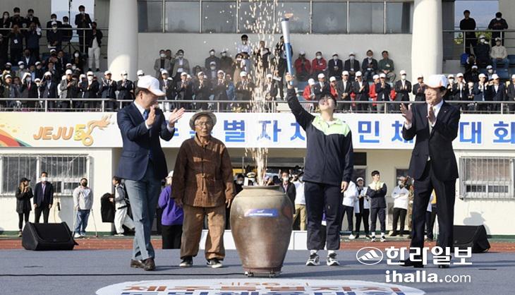 28일 오후 서귀포시 강창학경기장에서 열린 제56회 제주특별자치도민체육대회 개회식에서 성화 최종주자인 오예진이 오영훈 지사와 부평국 도체육회장 등과 항아리모형의 성화대에 점화화고 있다. 이상국 기자
