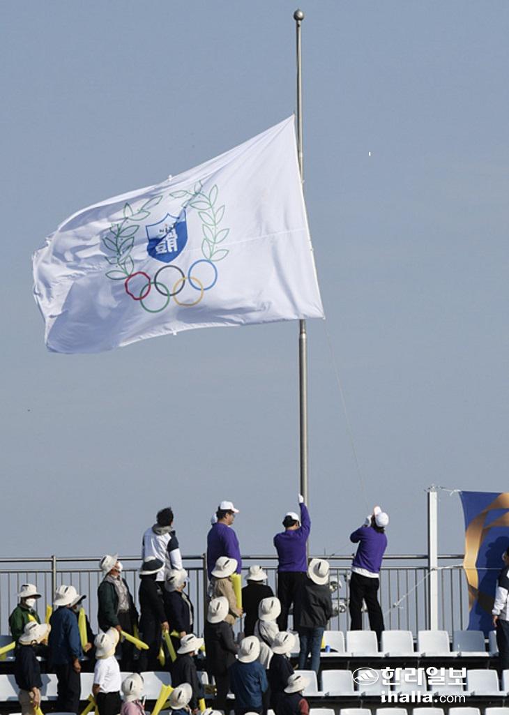 28일 오후 서귀포시 강창학경기장에서 열린 제56회 제주특별자치도민체육대회 개회식에서 대회기 게양되고 있다. 이상국 기자