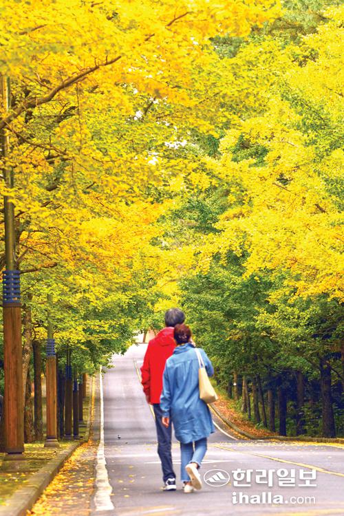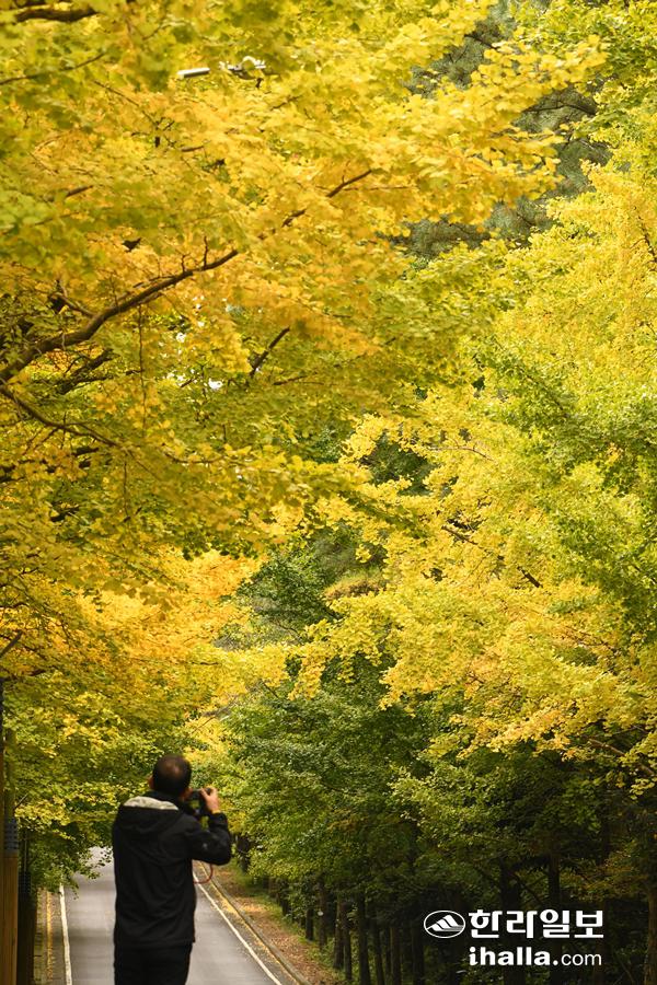 10월의 마지막 날인 31일 제주대학교 교수아파트 진입로에 은행나무들이 노랗게 물들어 가을의 정취를 한껏 보여주고 있다. 강희만기자