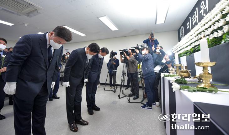 제주특별자치도는 31일부터 제주도청 별관에 이태원 참사 분향소를 설치·운영하고 있다. 이날 오영훈 제주지사가 구만섭 행정부지사, 김희현 정부부지사 등과 분향소를 찾아 분향하고 있다. 이상국기자
