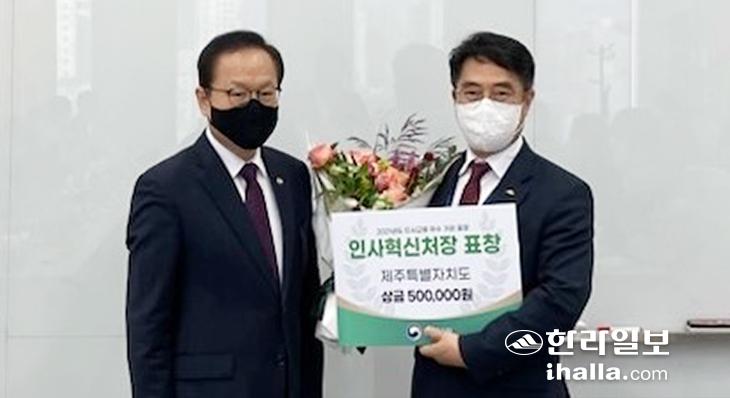 제주특별자치도가 2021년도 인사교류 평가에서 우수기관으로 선정돼 인사혁신처장 표창을 받았다.