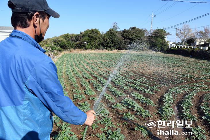1일 가을가뭄으로 월동채소 생육 저하가 우려되고 있는 가운데 제주시 조천읍 조천리 한 농민이 무밭에 물을 주고 있다. 강희만기자