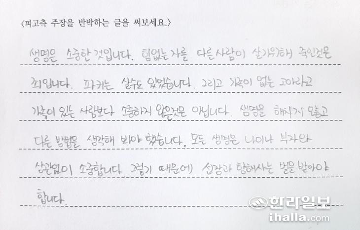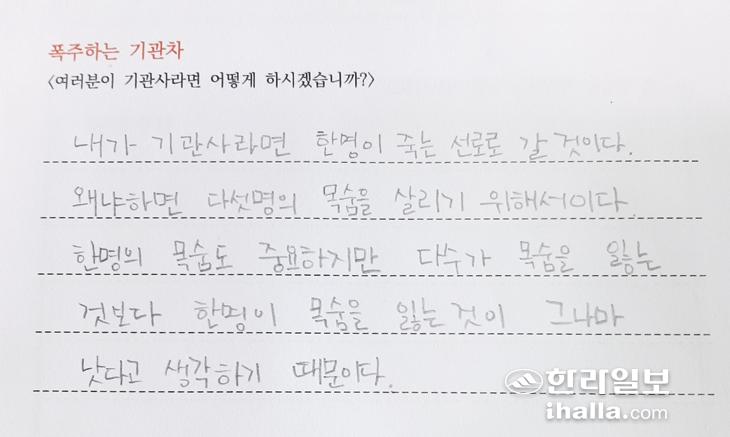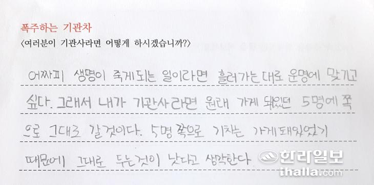 수업을 마치며 학생들은 혼란스러워했다. 그 혼란은 내 생각이 옳지 않을 수 있음을 깨달은 것과 과연 무엇이 옳은 것인지 질문들을 되뇌게 됐기 때문이다. 어린 학생들이지만 정의로운 사회에 대해 고민하기 시작했다. <남송희/제주NIE학회>