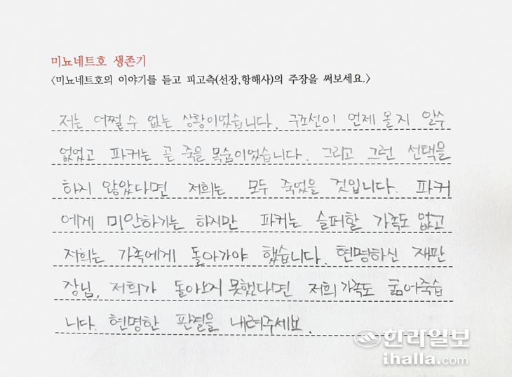 질문 2> '미뇨네트호 생존기' 읽고 피고측 주장글과 이를 반박하는 글 쓰기.