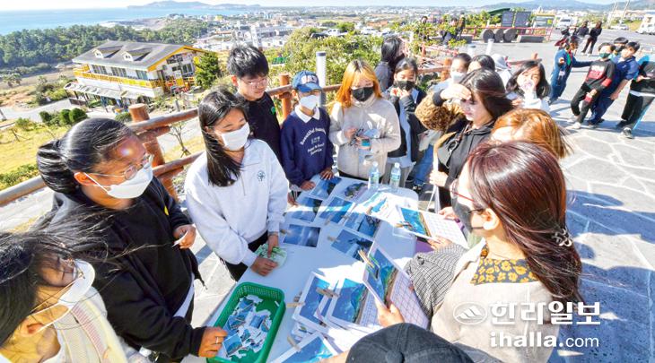 1일 서귀포시 안덕면 산방산 앞에서 사계초등학교 학생들이 사계STORE를 열어 직접 그림을 그리고 디자인한 키링과 엽서를 판매하고 세계시민교육과 지속가능계발의 중요성을 알리는 시간을 갖고 있다. 이상국기자