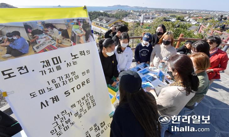 1일 서귀포시 안덕면 산방산 앞에서 사계초등학교 학생들이 사계STORE를 열어 직접 그림을 그리고 디자인한 키링과 엽서를 판매하고 세계시민교육과 지속가능계발의 중요성을 알리는 시간을 갖고 있다. 이상국기자